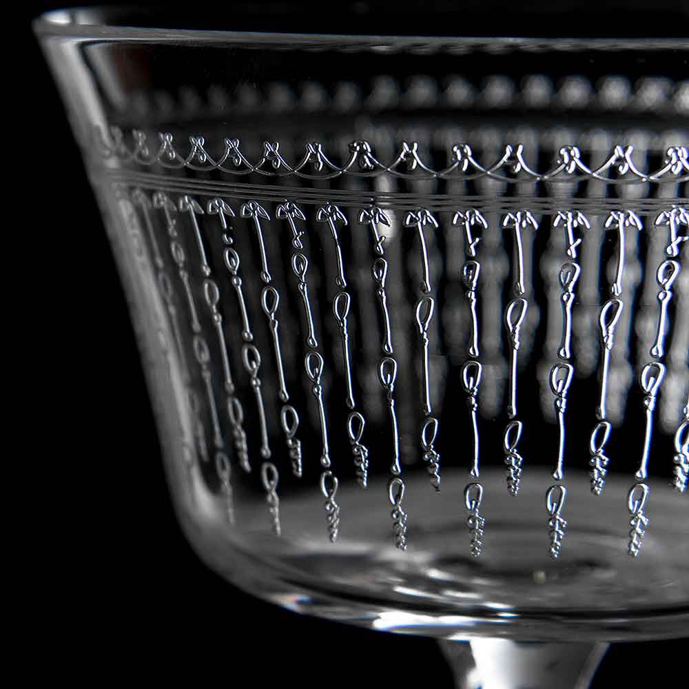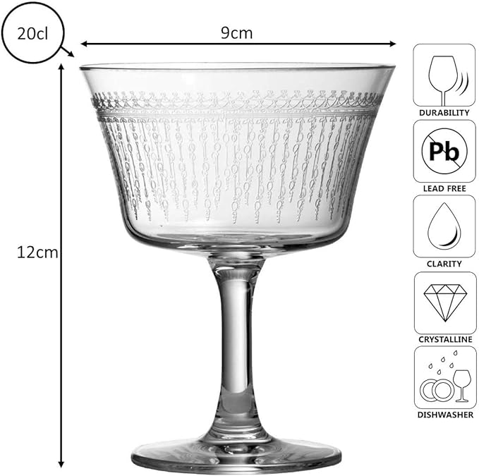 Ajoutez le charme vintage des années 1920 à vos boissons avec le verre à cocktail Retro Fizz 1920. Fabriqué en cristal transparent, son design gravé unique ressemble à du pétillant, ce qui le rend idéal pour les cocktails pétillants et le champagne.